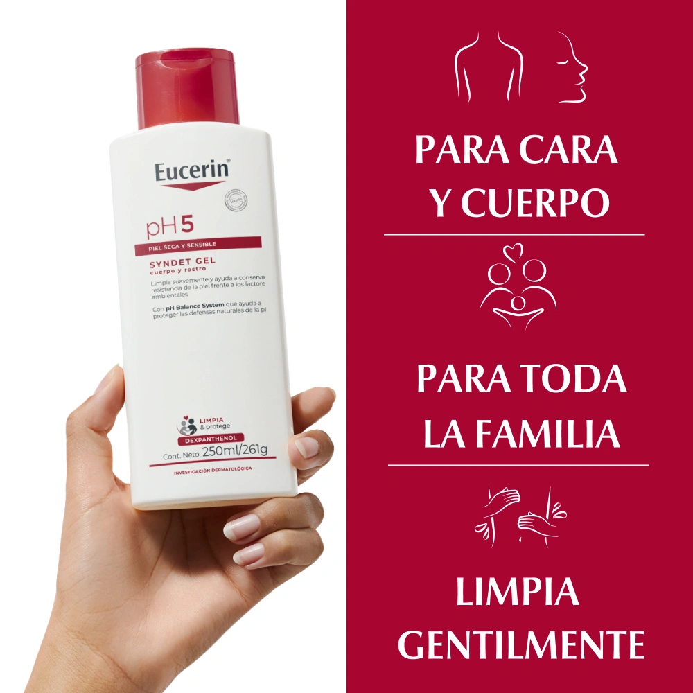 Eucerin pH5 Syndet Gel es un gel de ducha suave y efectivo, diseñado para limpiar la piel sensible sin alterarla. Su fórmula con pH balanceado protege la barrera cutánea natural, hidratando y manteniendo la piel suave y cómoda. Ideal para pieles secas, sensibles o propensas a irritaciones, este gel de ducha ofrece una limpieza suave y respetuosa para el bienestar de la piel de toda la familia.