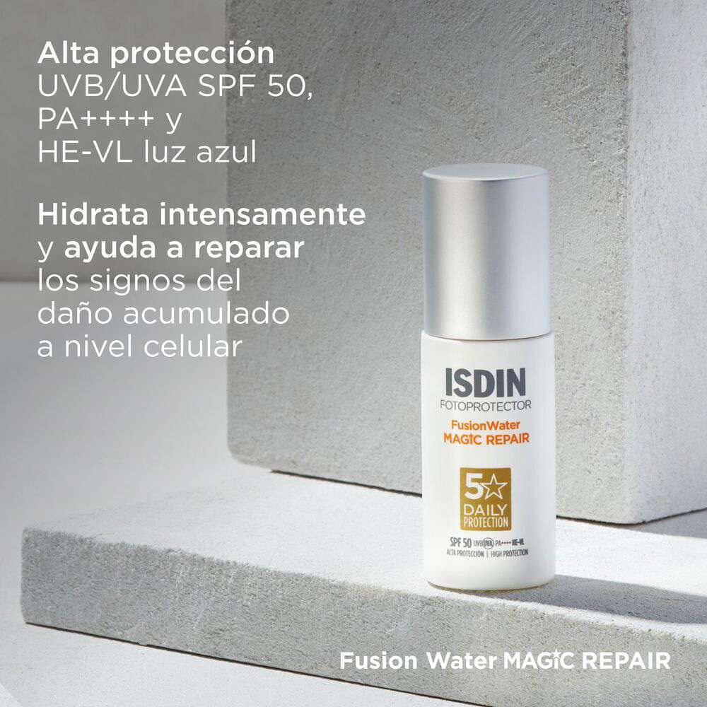 FotoUltra Age Repair Fusion Water SPF 50 de ISDIN ofrece una innovadora fórmula fotoprotectora de uso diario que ayuda a prevenir y corregir los signos del envejecimiento causados por el sol. Con textura ultraligera y absorción inmediata, proporciona una protección avanzada frente a los rayos UVA y UVB, mientras favorece la reparación del daño solar acumulado. Ideal para todo tipo de piel, incluso la sensible.