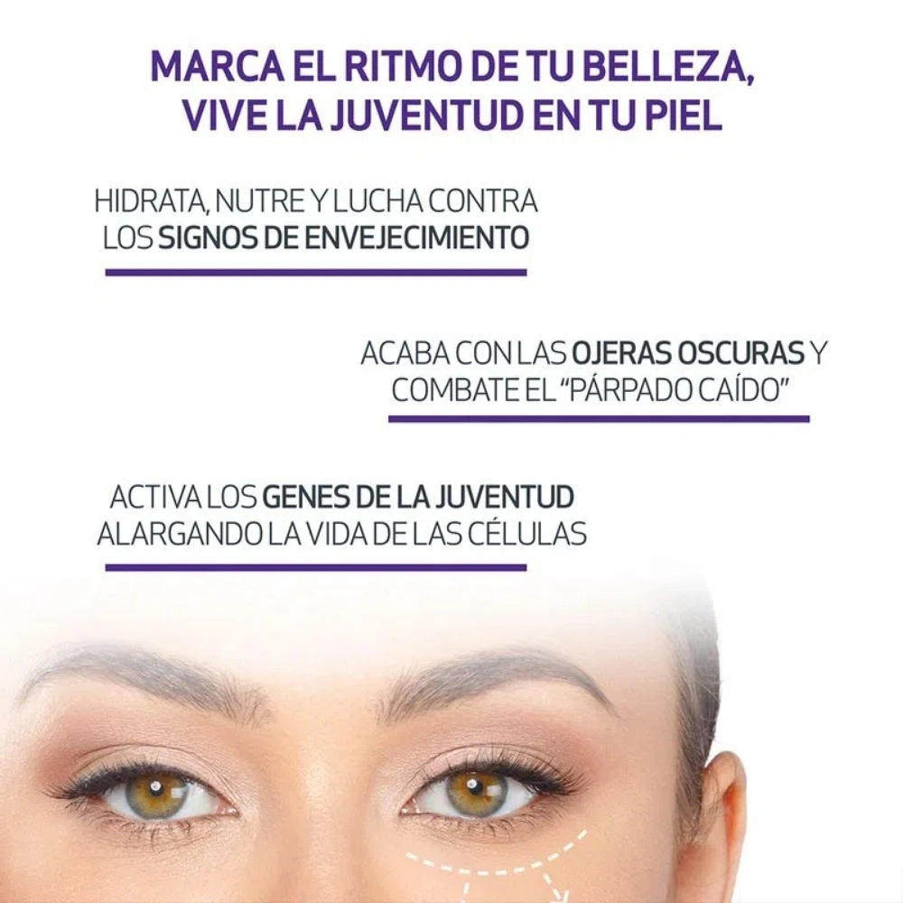Restaura los signos de juventud en la zona del contorno de ojos. Hidrata, nutre y lucha contra los signos de envejecimiento: acaba con las ojeras oscuras y combate el “párpado caído”. Activa los genes de la juventud alargando la vida de las células.